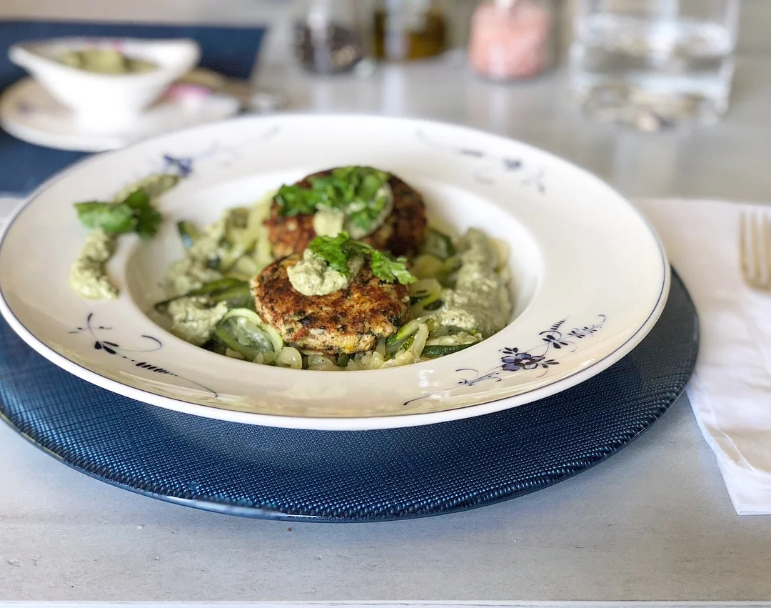 Today my lunch was: Green Salad with homemade Tahini dressing and avocado chunks, followed by Zucchini & Carrot Noodles with homemade Walnut-Basil Pesto + 2 Salmon “Burgers” (homemade salmon patties, using canned wild salmon, tons of chopped green herbs, spices and a flax egg to hold it together - see recipe below).