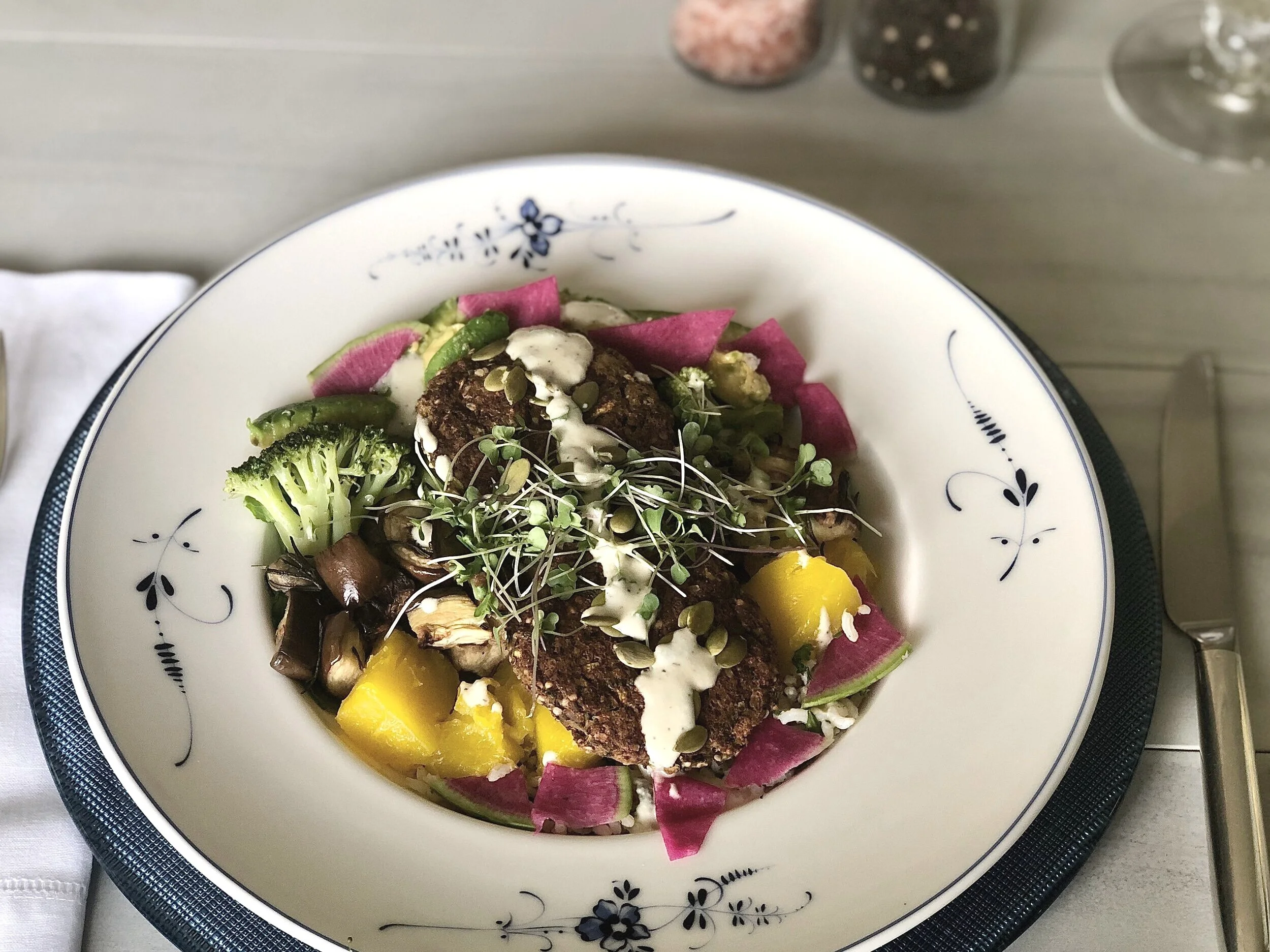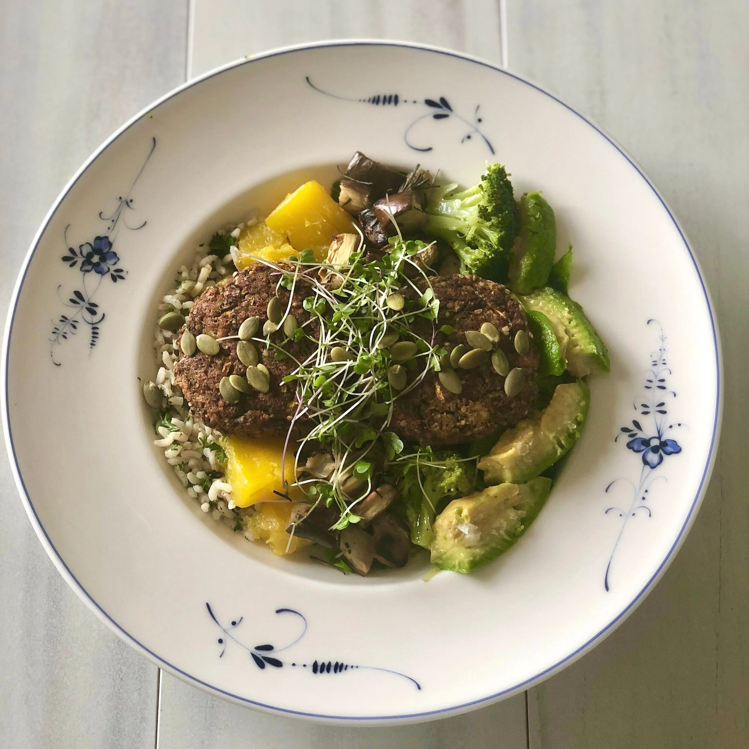 4. Create your bowl. I like to create a base of greens + grains, roughly ¾ salad greens + ¼ brown rice. Then add the roasted veggies, lentil burgers (or veggie patties or choice) and sliced avocado - side by side. Top off with the microgreens and the pumpkin seeds. Lastly, drizzle the Tahini dressing over the bowl.